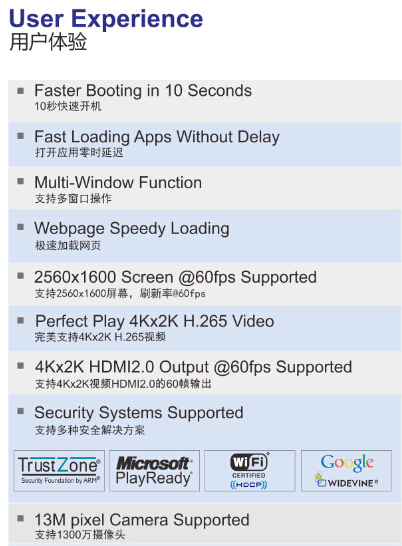 瑞芯微RK3288芯片自3月份发布以来,凭借硬件配置已经受到诸多消费者的青睐,而其工程师团队则一直在坚持进行优化工作。其中最受消费者注意的是搭载RK3288芯片的产品,10秒快速开机的新技术。瑞芯微在本次香港电子展上,还公布了RK3288九大技术,包括打开应用零时延迟、支持多窗口操作、极速加载网页、支持2560x1600屏幕、支持4Kx2K视HDMI 2.0的60帧输出、支持多种安全解决方案、支持1300万摄像头等。将智能终端产品的性能、亲和力、舒适度、人性化发挥到极致。