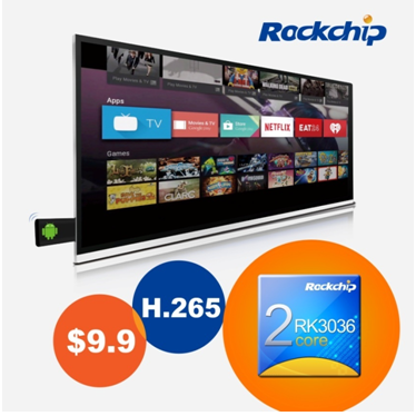 该方案采用RK3036芯片,支持H.265。产品通过直连电视设备,即可让用户获得完整盒子体验效果。9.9美金的方案将极大推进盒子全面普及进程。