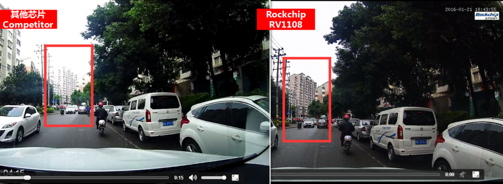 视频中红框指示处可以看出显著差别,在其他芯片拍摄画面中,由于光线太强反光明显,大楼消失在画面中,而RV1108很好的对图像曝光进行了处理,大楼清晰可见,凸显在WDR“宽动态”方面的优秀表现。