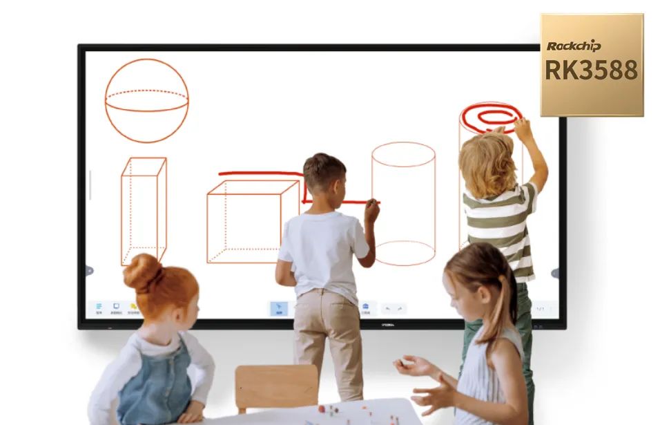 区别于传统仅用于教学演示的大屏,搭载RK3588的RC系列集高清显示、交互式电子白板、电脑、电视、音箱等多功能于一身,可实现内容数字化和学情数据化,具备人机交互、智能识别、学习数据分析等功能。